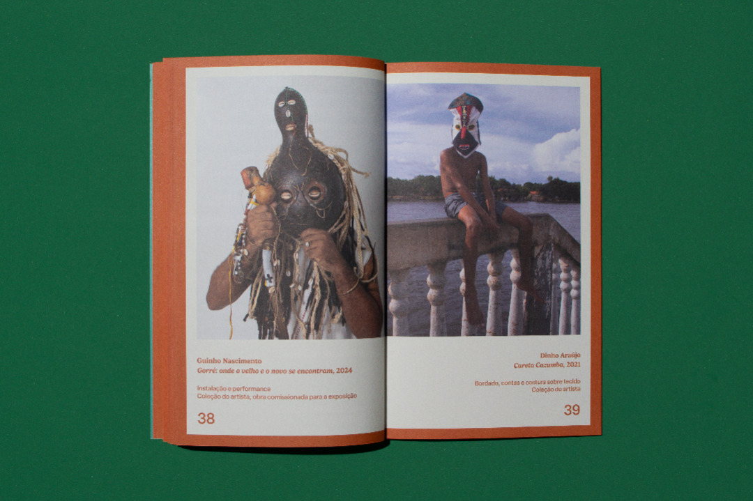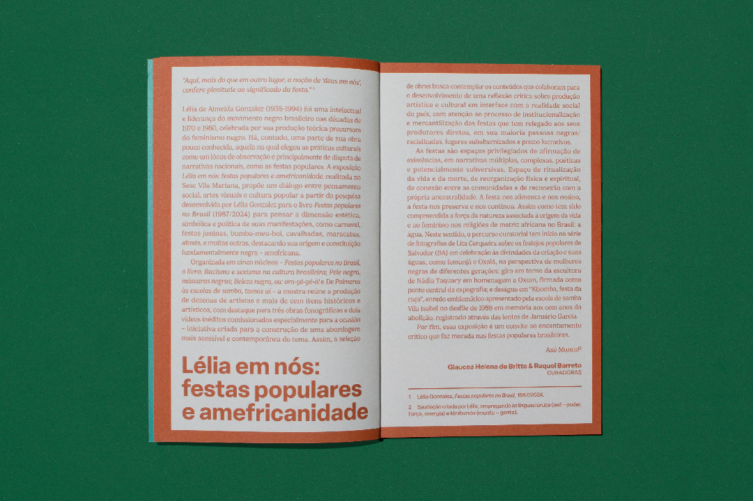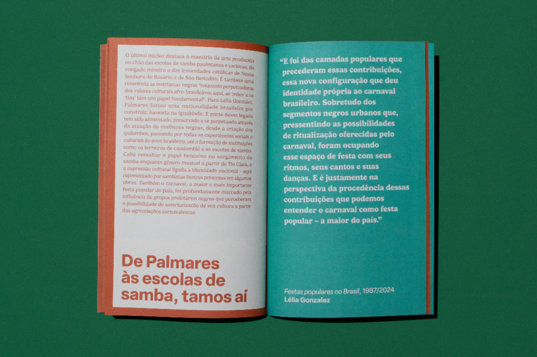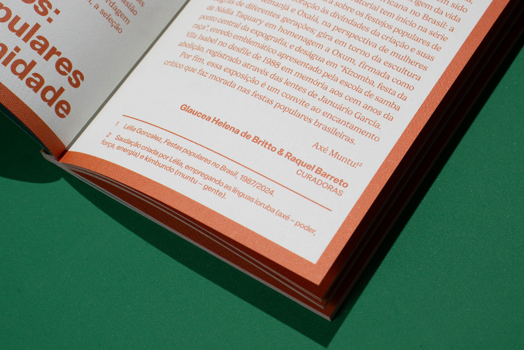 The visual identity is inspired by popular festivals and is based on two main concepts: modularity and layers. Modularity is found both in the clothing used in the festivals, made with thousands of sequins, strips of fabric and other materials, and more broadly in the individuals who, together, demonstrate collective strength. These ideas are expressed in the exhibition's sign, in which the rectangular modules form the letters of the title. The layers present in the masks and costumes of some of the Afro-Brazilian festivities researched allude to the mystery and provocation often present in these moments when time is suspended. In the visual communication, the titles of the texts in each exhibition section are cut out, revealing the color of the back of the plates that hold them.