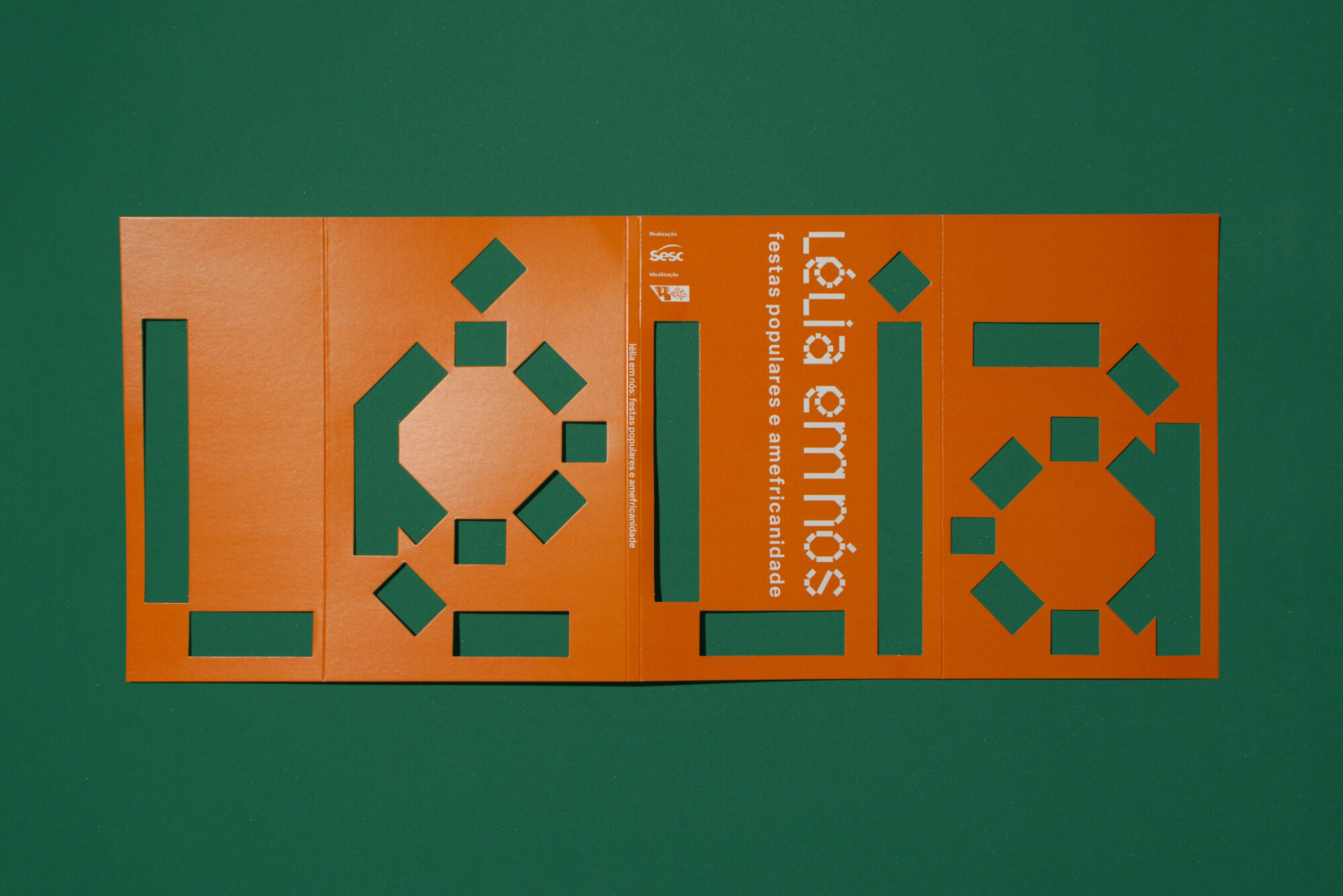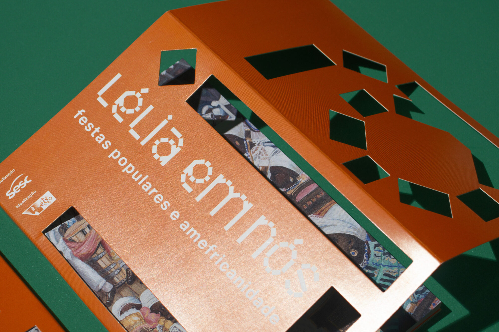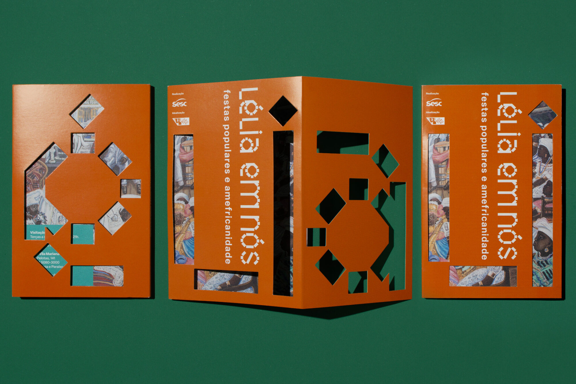 The visual identity is inspired by popular festivals and is based on two main concepts: modularity and layers. Modularity is found both in the clothing used in the festivals, made with thousands of sequins, strips of fabric and other materials, and more broadly in the individuals who, together, demonstrate collective strength. These ideas are expressed in the exhibition's sign, in which the rectangular modules form the letters of the title. The layers present in the masks and costumes of some of the Afro-Brazilian festivities researched allude to the mystery and provocation often present in these moments when time is suspended. In the visual communication, the titles of the texts in each exhibition section are cut out, revealing the color of the back of the plates that hold them.