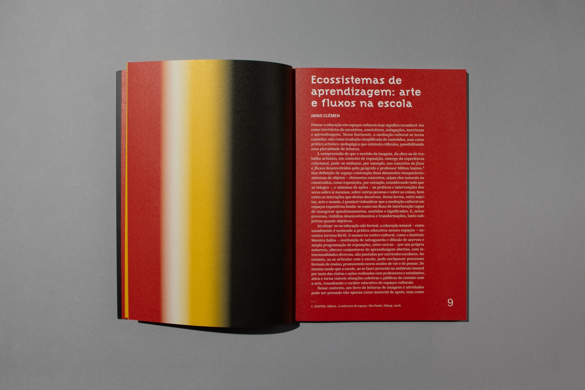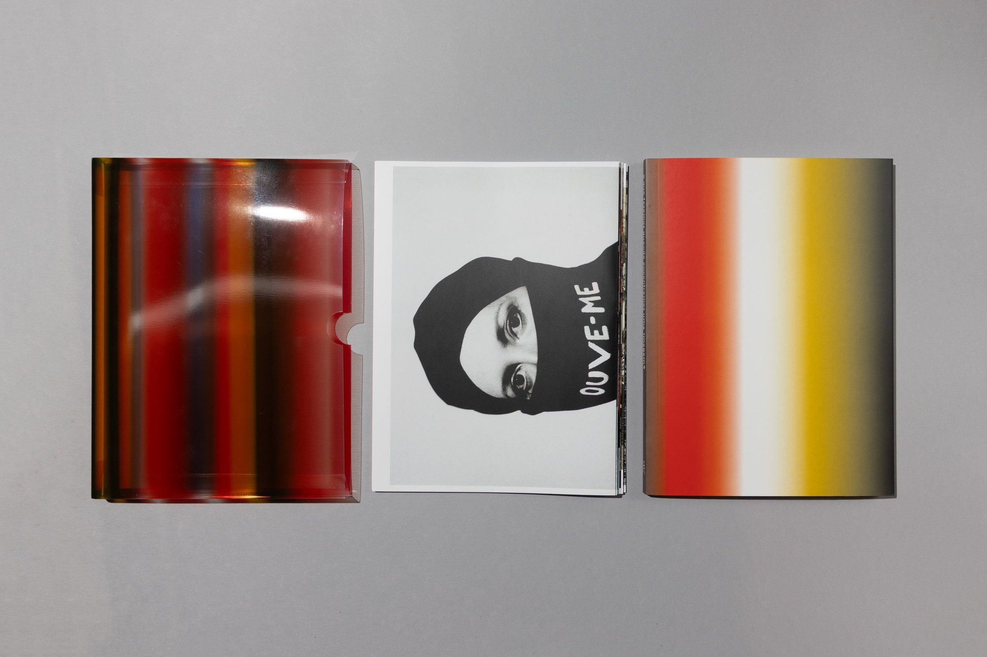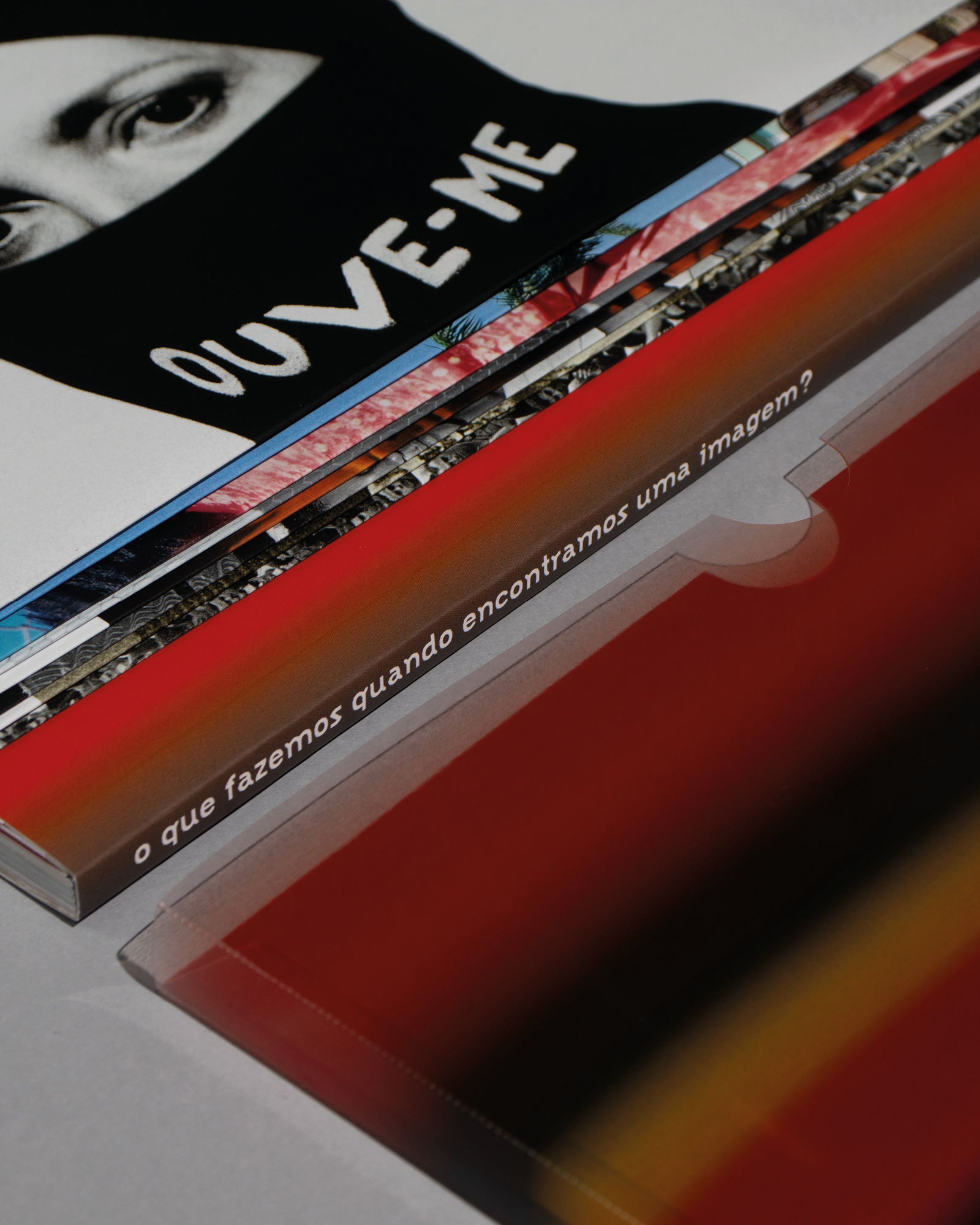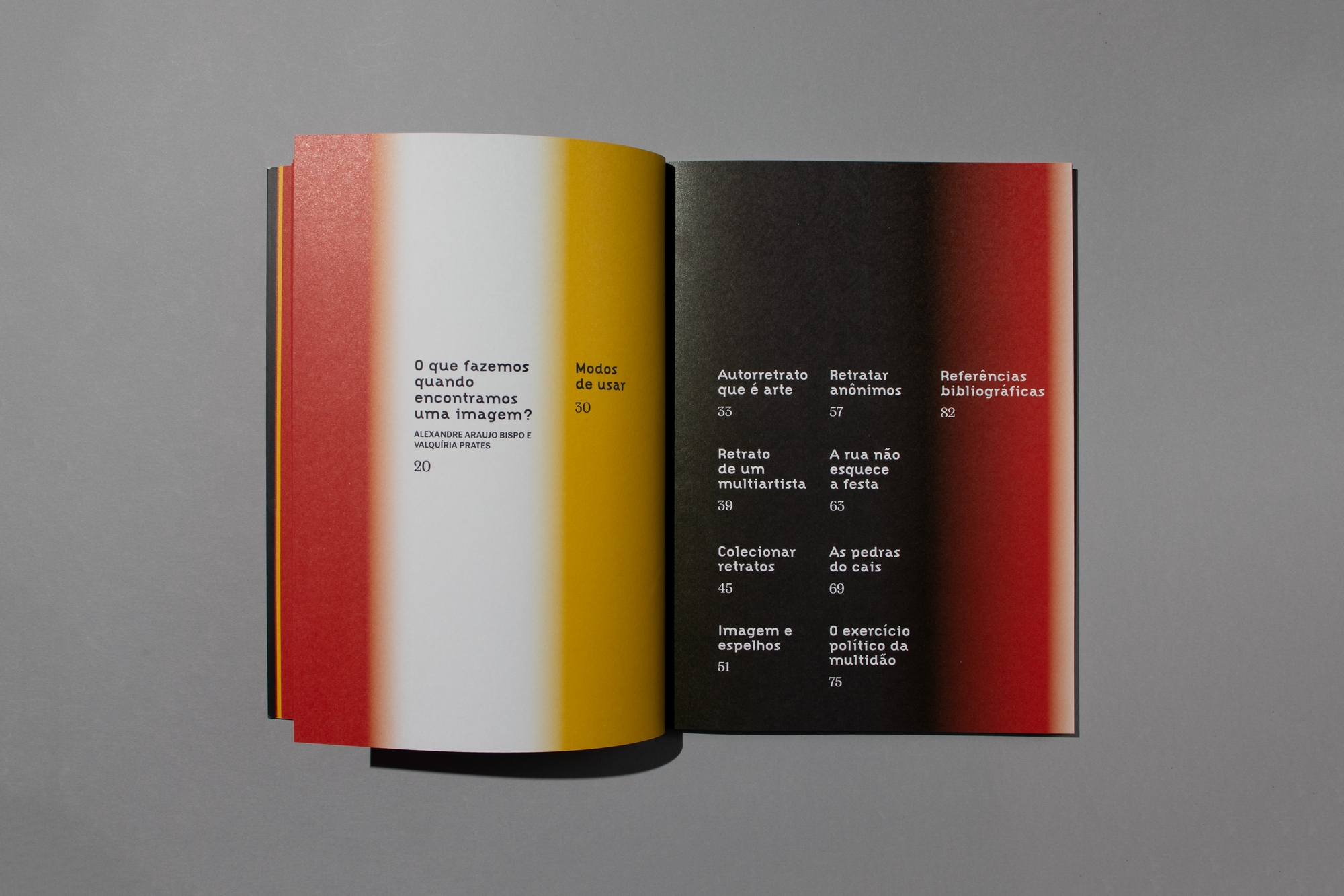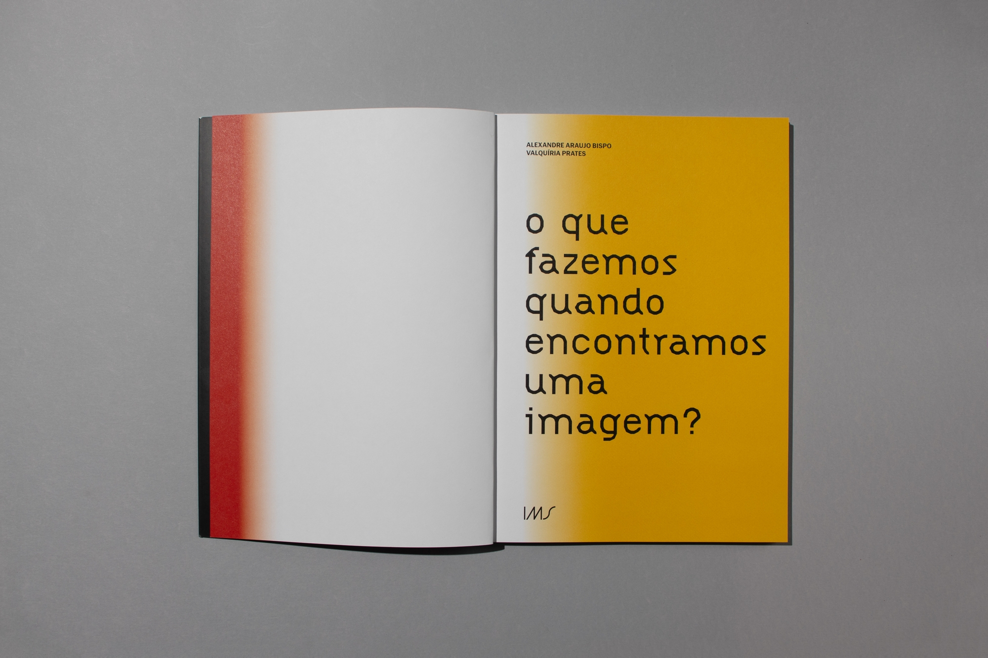 The book’s cover features no text, highlighting the publication’s title [What do we do when we come across an image?] and emphasizing the project’s visual nature. The eight enlarged reproductions of the images were printed on separate sheets from the book, making them independent and facilitating their use in the classroom. The set consisting of the book and the image sheets is bound together and protected by a transparent polystyrene sleeve printed with the gradient that forms the project’s visual identity.