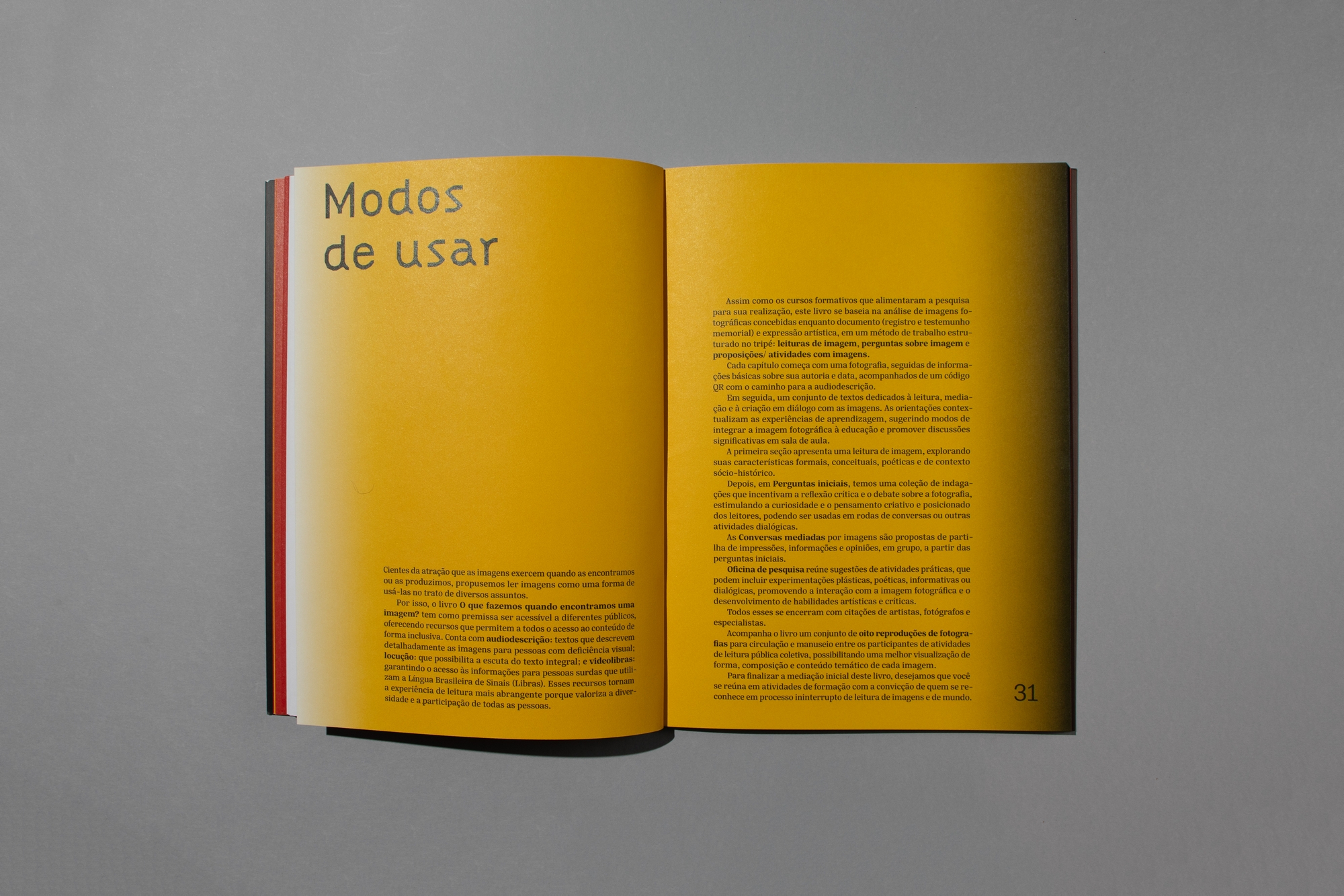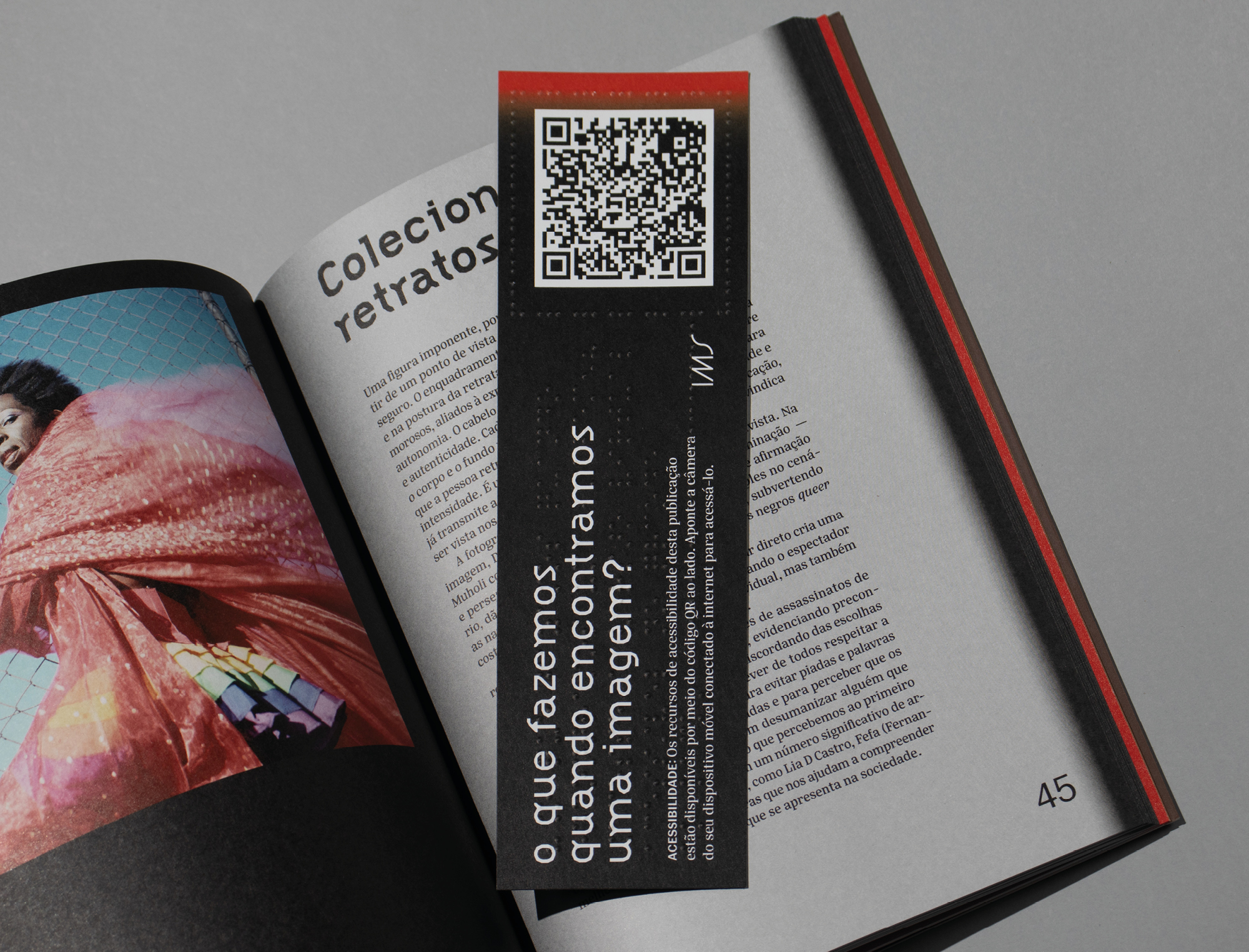 In late 2024, we were commissioned to create the graphic design for the department’s first book, conceived specifically for teachers. The publication explores Brazilian and international artistic works from the IMS collection or those that have been part of exhibitions, with a focus on the human figure. The goal is to foster a diverse dialogue about photography, time, territory, and memory. The book includes enlarged reproductions of the images for use in the classroom, as well as accessibility features such as Braille bookmarks, sign language videos, audio description, and narration.