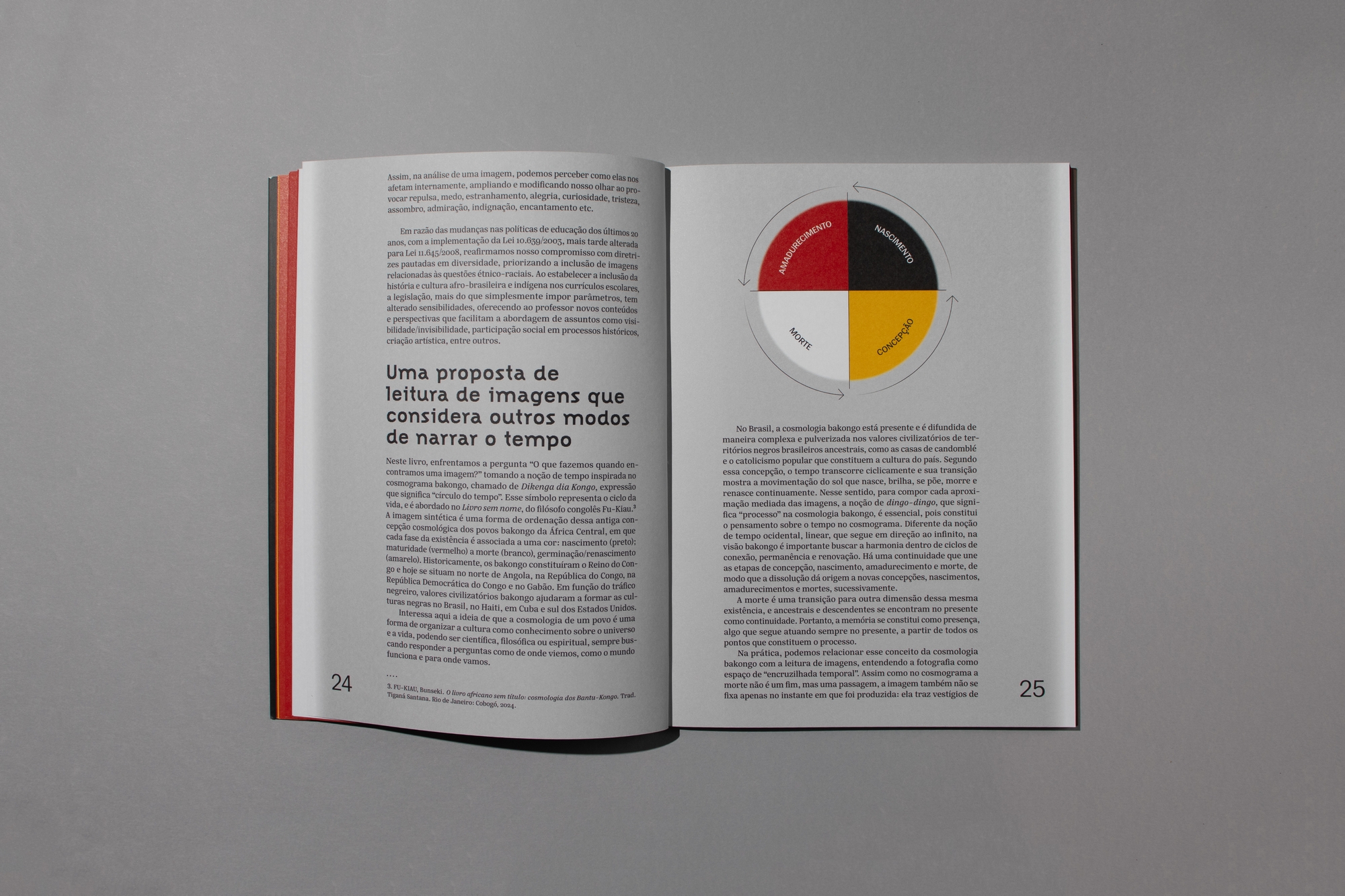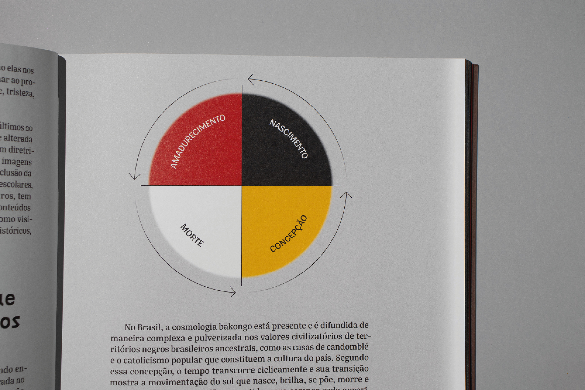 Drawing inspiration from the Dikenga—a Bakongo cosmogram that symbolically represents the great cycles of the sun, life, the universe, and time—we selected the project’s colors and created gradients that blur the transition between one color and another, with the aim of reinforcing the continuity and simultaneity of the presented content.