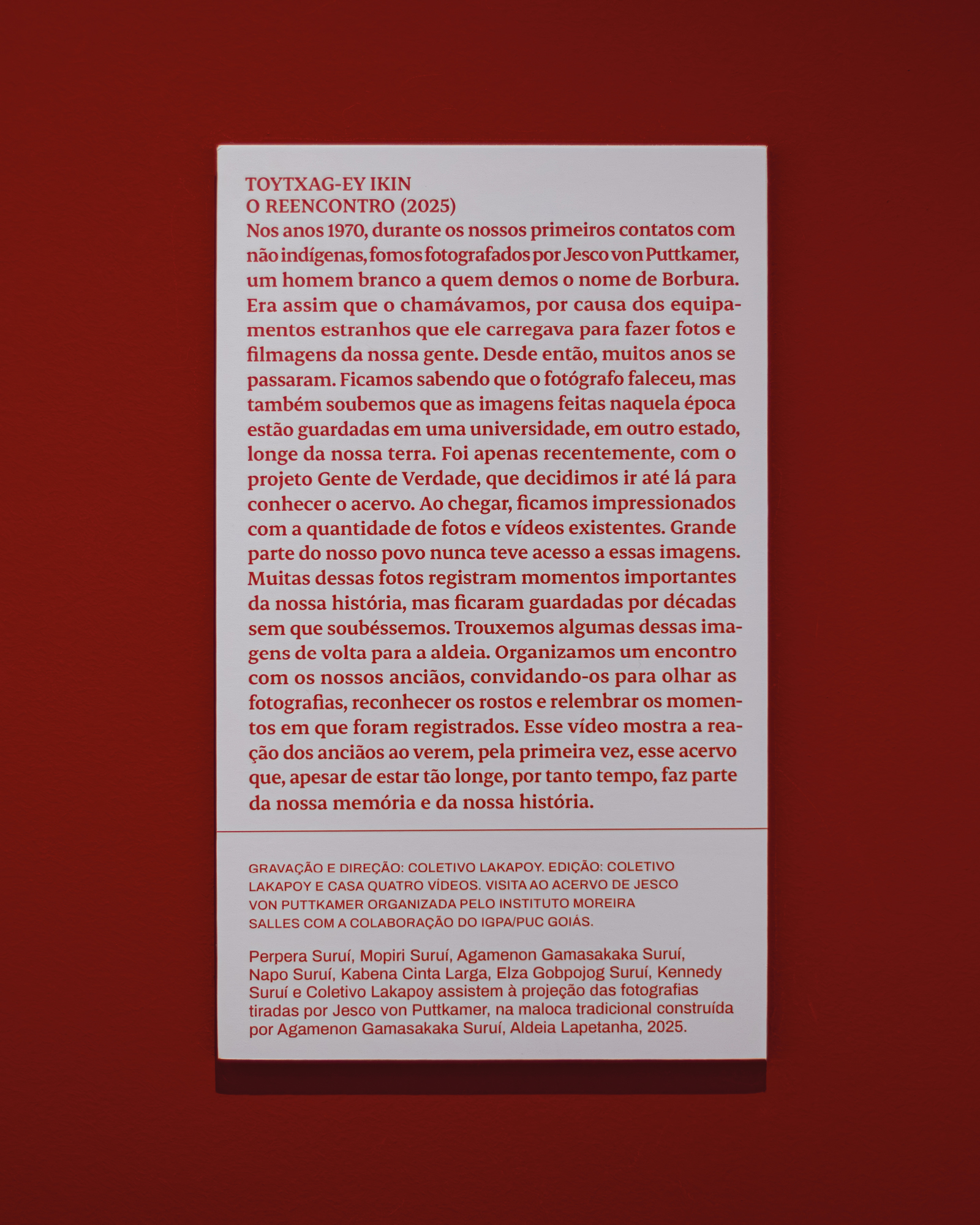 The material was collected and digitized by the Lakapoy Collective, a pioneering indigenous audiovisual group, whose members participated in the exhibition project: Ubiratan Gamalodtaba Suruí, Oyexiener Suruí, Gabriel Uchida, Christyann Ritse, Kennedy Suruí, Txai Suruí, Oyago Suruí, Samily Suruí, and Oyorekoe Luciano Suruí.